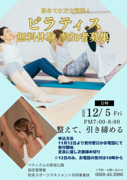 ベティさんの家旭公園では12月5日(金)にピラティス無料体験教室を開催いたします。